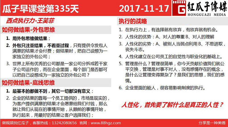 2、企業(yè)的結果是靠每一個員工提供的,市場是現(xiàn)實的,為客戶提供滿意的結果才會愿意給我們付錢,那么就讓我們從現(xiàn)在的事情開始,從眼前的事情開始,執(zhí)行起來,用最好的結果讓客戶選擇我們;