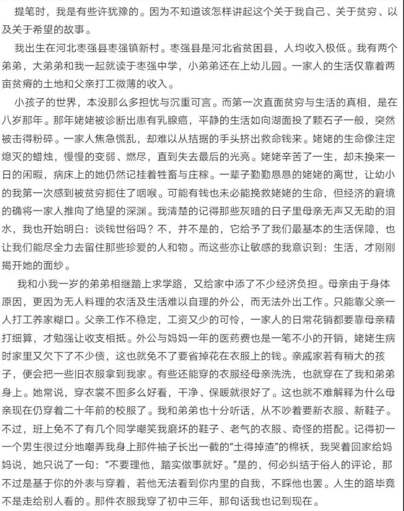 王心儀此前寫的一篇關(guān)于自己、關(guān)于貧窮、關(guān)于希望的文章,一經(jīng)發(fā)出以后感動(dòng)了許多網(wǎng)友。