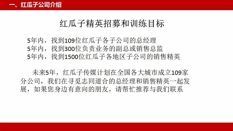 紅瓜子愿景是打造卓越的上市企業(yè),建設(shè)優(yōu)秀的民族品牌,目前有6個地區(qū)的子公司,2018年底拓展到25個子公司,2019年底拓展到50個子公司,2020年底到100個子公司,紅瓜子計劃2022年上市,登上創(chuàng)業(yè)板.