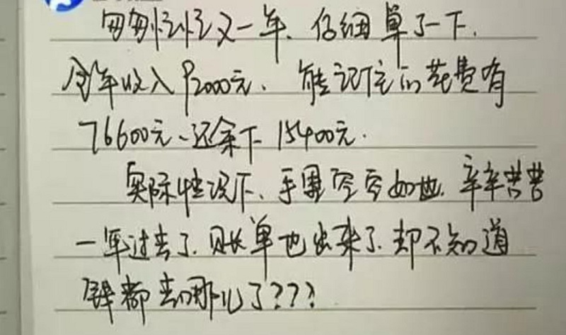 鄭州一輛公交車上,發(fā)現(xiàn)了一本遺失的筆記本。翻開筆記本,上面密密麻麻記錄著一年的收支,母親看病的花費、走親戚、日常開支……辛苦一年,真的沒剩下多少錢。