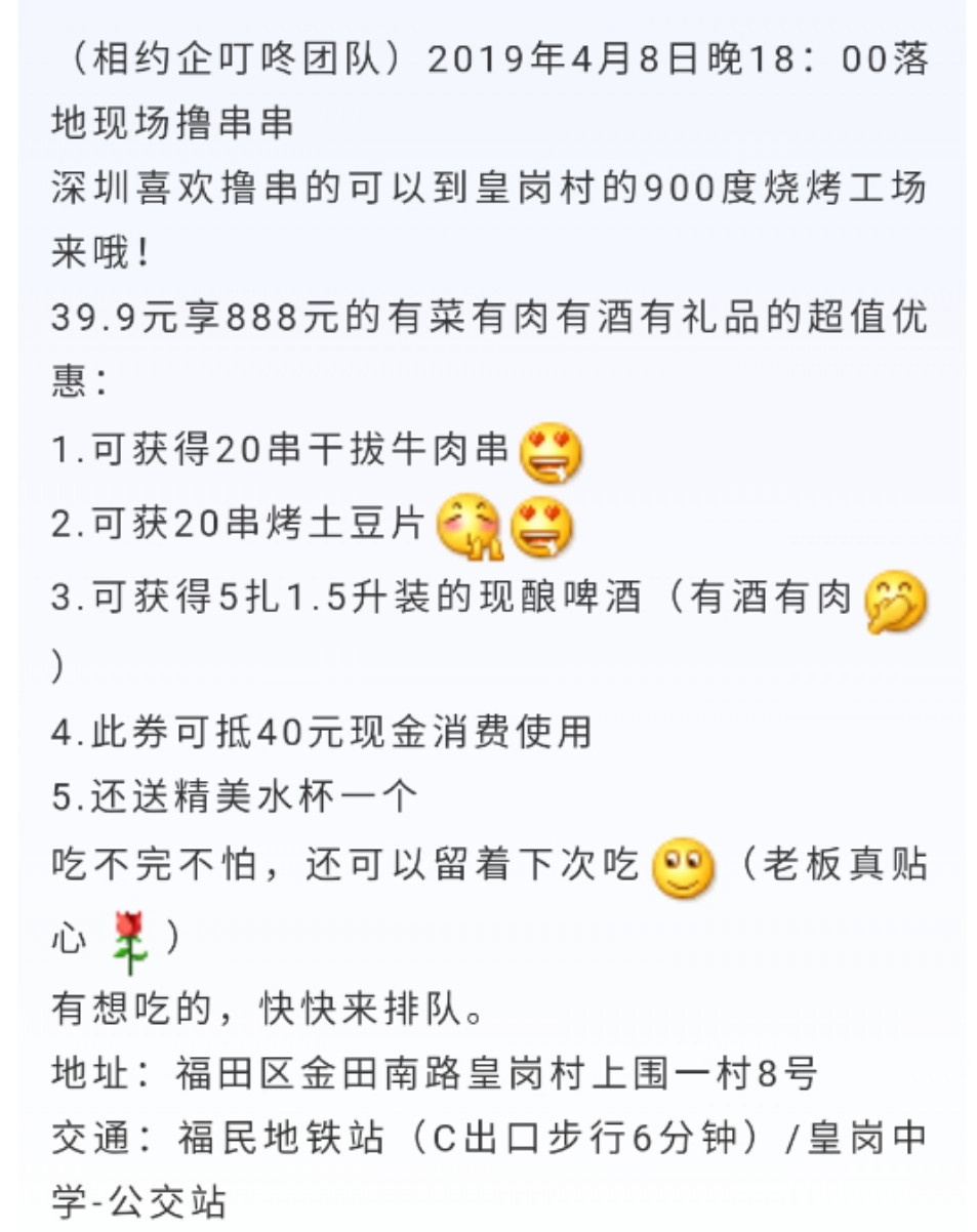 深圳福田皇崗村,900度燒烤店,通過合作業(yè)績倍增模式,5天時間賣掉1000張體驗卡!活動場面火爆,想知道如何做的?歡迎聊聊~