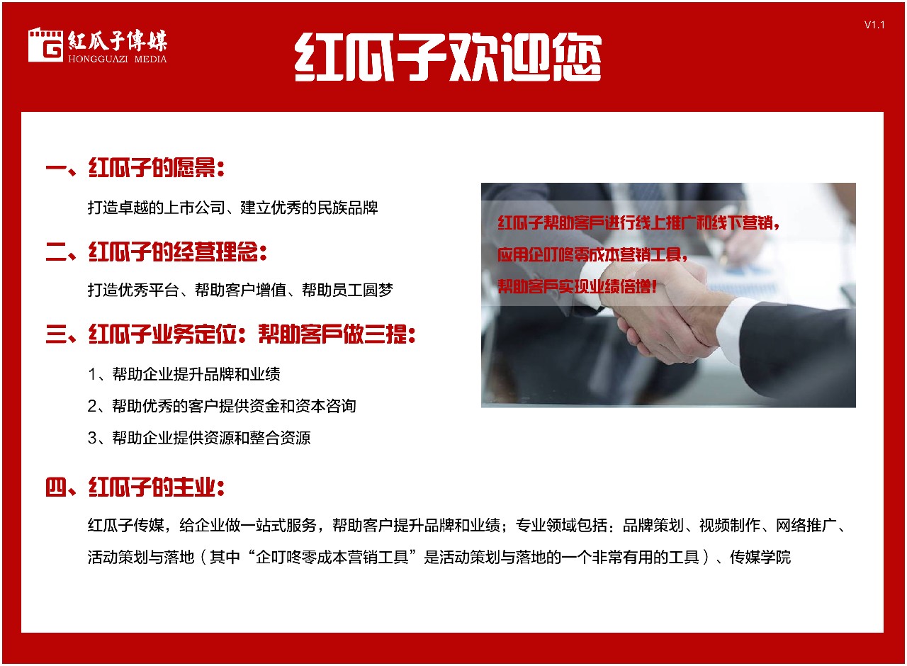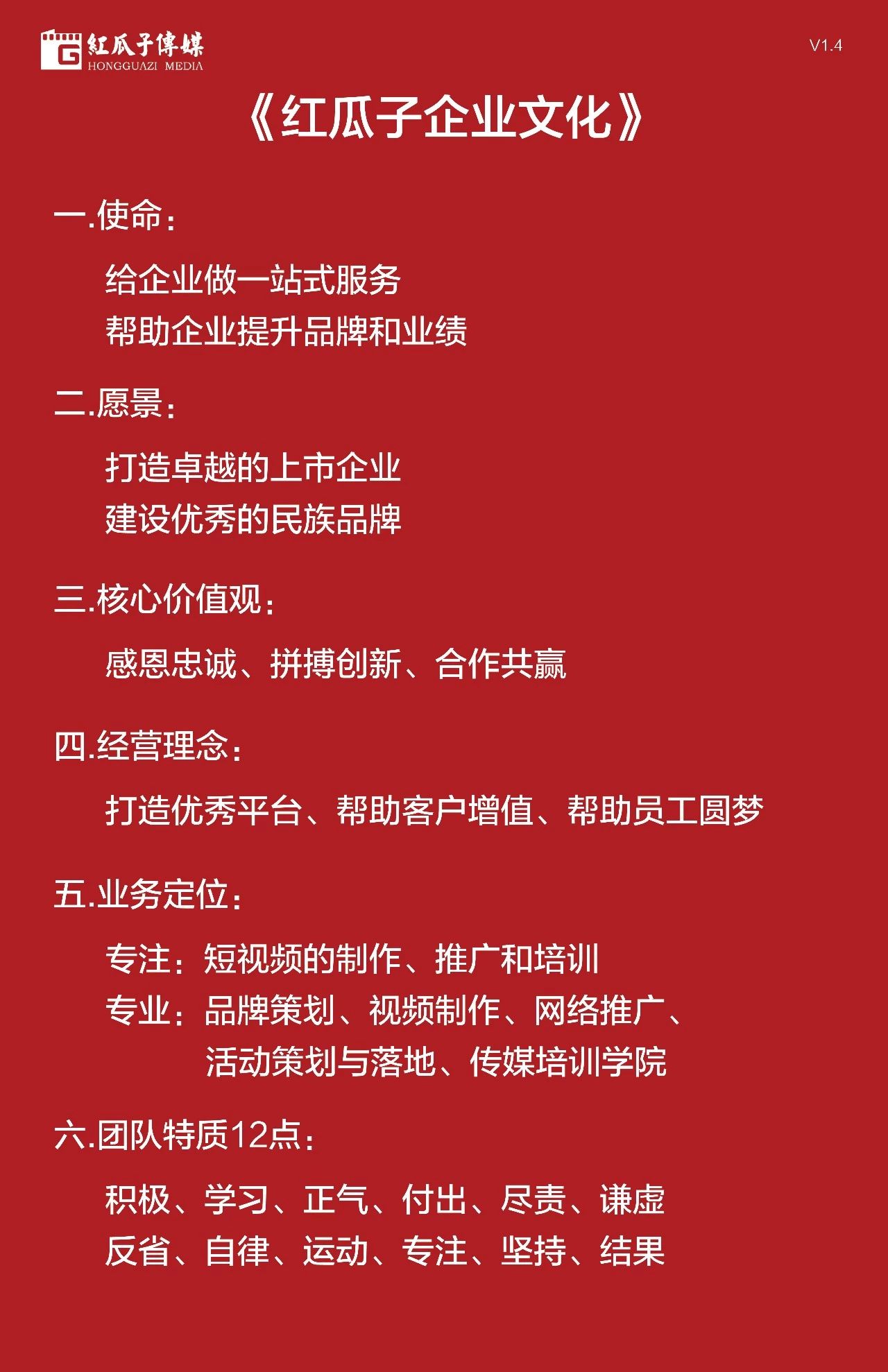 9、經(jīng)營理念:“打造優(yōu)秀平臺(tái),幫助客戶增值、幫助員工圓夢”,這是寫在紅瓜子企業(yè)文化中的最重要的一條,未來的競爭是企業(yè)文化的競爭,企業(yè)文化對(duì)內(nèi)凝結(jié)人心,打造團(tuán)隊(duì),對(duì)外吸引客戶,組成同盟,現(xiàn)在已經(jīng)是營銷3.0時(shí)代,企業(yè)文化是優(yōu)秀供應(yīng)商評(píng)估的重要指標(biāo),紅瓜子企業(yè)文化的理念是打造優(yōu)秀平臺(tái),幫助客戶增值、幫助員工圓夢,客戶的認(rèn)同和體驗(yàn)感是紅瓜子最重要的追求
