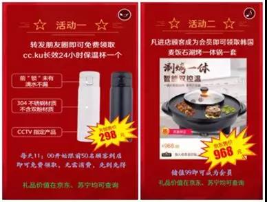 引流產品是,你轉發(fā)朋友圈即可免費領取價值298元的保溫杯一個(限名額、時間)。開門產品是,凡是進店顧客成為會員即可免費領取價值968元的韓國麥石飯涮烤一體鍋一套。