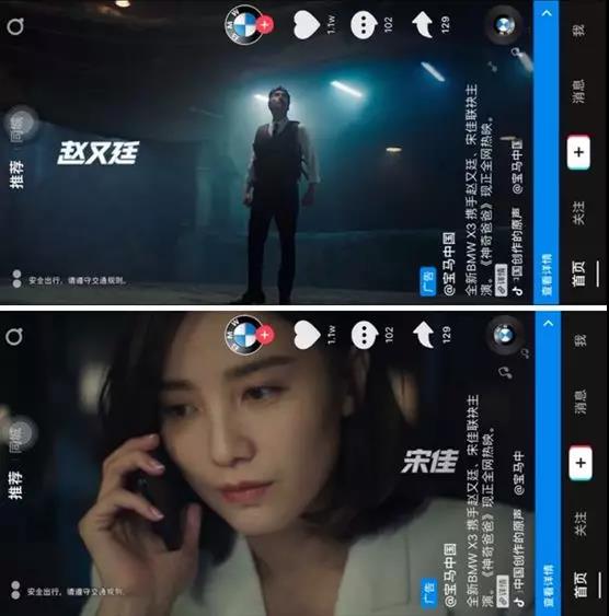 高人氣明星助陣加盟也為寶馬品牌吸睛無數(shù),借勢明星效應(yīng),有效滲透粉絲圈層,為寶馬抖音藍V強勢拉攏粉絲人氣。如趙又廷與宋佳出演的BMW X3上市微電影《超級爸爸》,僅前期預(yù)熱便為寶馬藍V增粉11.7萬;BMW X2與辛芷蕾高顏組合推出時尚大片,帶動粉絲增長3.2萬;寶馬新1系攜手王嘉爾獻上情人節(jié)驚喜TVC也為寶馬贏得10.5萬粉絲。