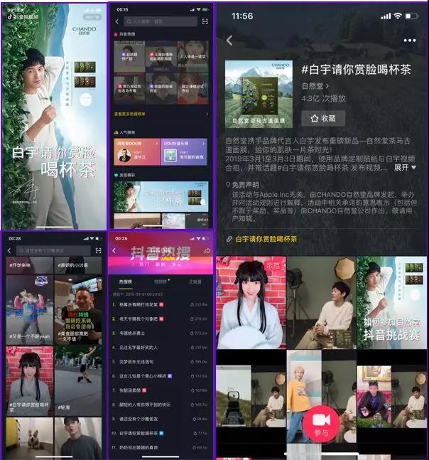 自然堂攜手代言人白宇,推出全新的茶馬古道面膜。在3月7日自然堂天貓旗艦店首發(fā)前,3月1日先在抖音上發(fā)起挑戰(zhàn)賽#白宇請(qǐng)你賞臉喝杯茶#。自然堂抖音官方賬號(hào)發(fā)布一條白宇拍攝的母視頻,引導(dǎo)用戶(hù)合拍,并邀請(qǐng)抖音頭部達(dá)人拍攝示范視頻,上線(xiàn)3天內(nèi)挑戰(zhàn)賽話(huà)題的視頻播放量突破5億;截至3月10日,視頻播放量達(dá)到6.3億。