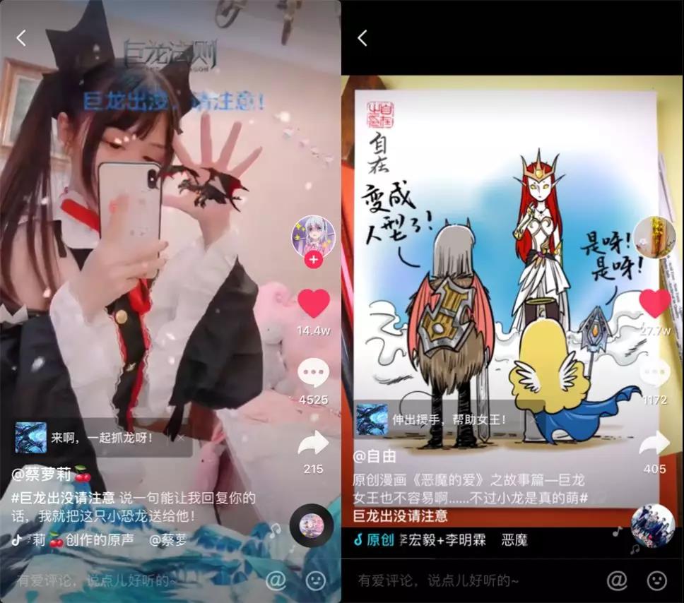 不難發(fā)現(xiàn),單看《巨龍法則》這一次的抖音挑戰(zhàn)賽,有不少頂級流量達人參與到挑戰(zhàn)賽的活動當(dāng)中,例如蔡蘿莉、呼叫網(wǎng)管、自由等等。游戲廠商通過在星圖給達人下單,組建泛娛樂達人與垂類達人團,從游戲產(chǎn)品的世界觀劇情、主要人物、玩法特色、配音等多維度創(chuàng)作內(nèi)容,打造內(nèi)容營銷矩陣,擴大品牌輻射范圍。并通過達人團的引導(dǎo),讓抖音用戶跟隨他們產(chǎn)出視頻,催生游戲內(nèi)容的爆發(fā)。