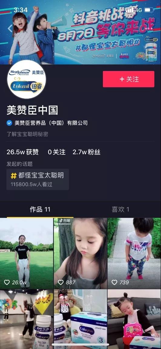 這個8月,美贊臣鉑睿帶動萌娃潮流,開啟母嬰行業(yè)抖音營銷的新玩法——截止8月9日,美贊臣鉑睿在抖音舉辦的#都怪寶寶太聰明#挑戰(zhàn)賽,總播放數(shù)(vv)超過7億,挑戰(zhàn)賽擁有19萬用戶參與,收獲了2400多萬點贊、90多萬的評論和100多萬次分享。截止發(fā)稿前,挑戰(zhàn)賽熱度持續(xù)攀升,已經(jīng)有超過12億總播放數(shù)(vv),和破21萬的用戶參與量。