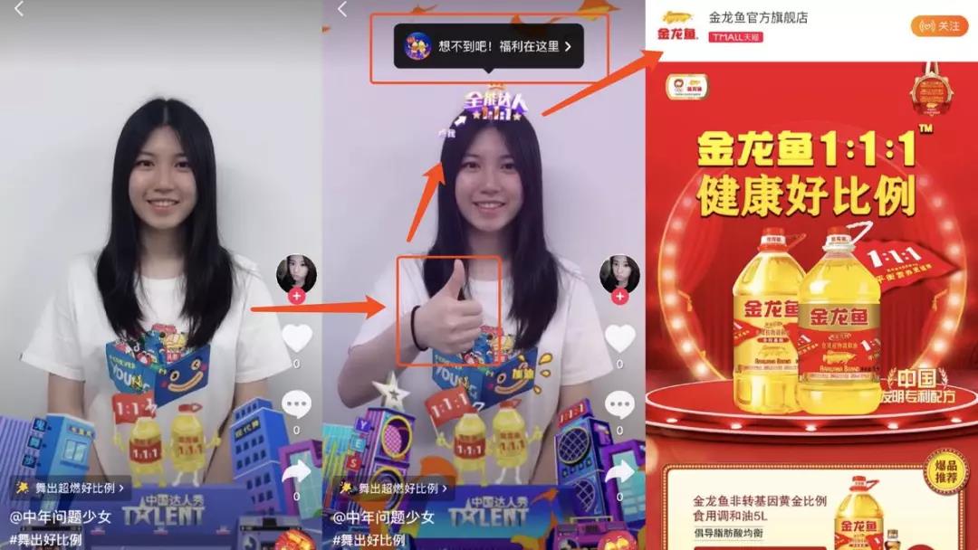本次活動中,金龍魚1:1:1品牌玩兒了票大的,直接將中國達人秀“搬”上了抖音平臺,每一位用戶都能在活動中化身全能達人,在酷炫的達人秀舞臺與金龍魚小油人互動,同時通過點贊手勢觸發(fā)貼紙彩蛋,點擊貼紙即可跳轉金龍魚官方旗艦店,真正做到品效合一。