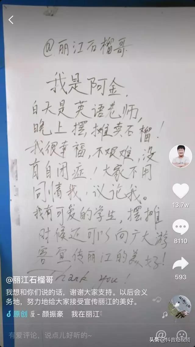 石榴哥不認(rèn)為他憑借一己之力走到了現(xiàn)在,而是互聯(lián)網(wǎng)時(shí)代、抖音平臺(tái)、數(shù)百萬厚愛他的網(wǎng)友共同造就出了這個(gè)小小奇跡。他也感謝從來沒有放棄過的自己。石榴哥就像一顆滾燙的石子,投入水中,水便沸騰,因?yàn)樾刂袑?duì)生活的一腔熱愛——無論順境還是逆境。他之所以受到不少網(wǎng)友喜愛,是因?yàn)槿藗儤芬娺@樣的故事:一個(gè)自詡平凡的人,在困境中快樂地努力著,他成功了,他開始做更大的事,幫助更多人。