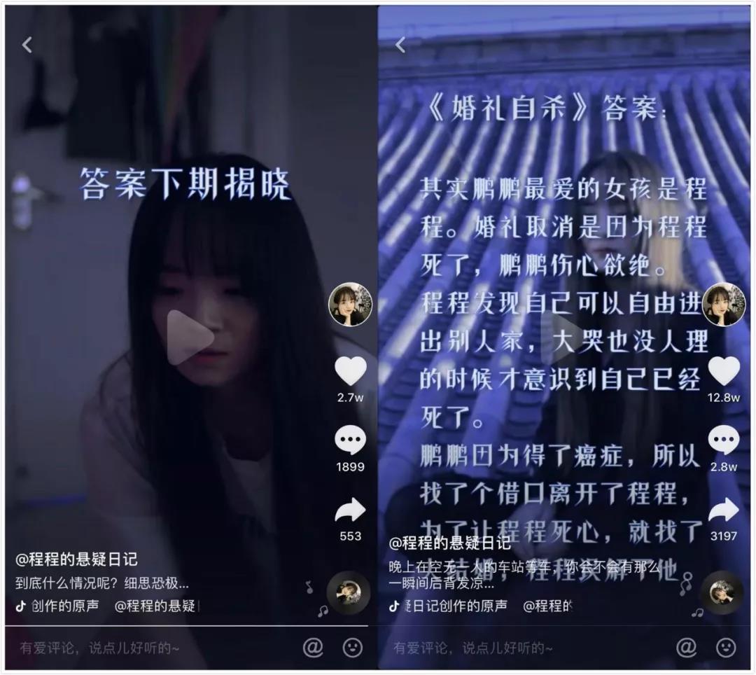 由于抖音對視頻的時(shí)間限制,以及視頻播放量和完播率對抖音流量推薦的影響,「程程的懸疑日記」等懸疑類賬號(hào)會(huì)通過在視頻結(jié)尾提醒推理答案在下期視頻結(jié)尾,由此提高視頻點(diǎn)擊量和完播率,讓觀眾有“在抖音看豎屏連續(xù)劇”的感覺。